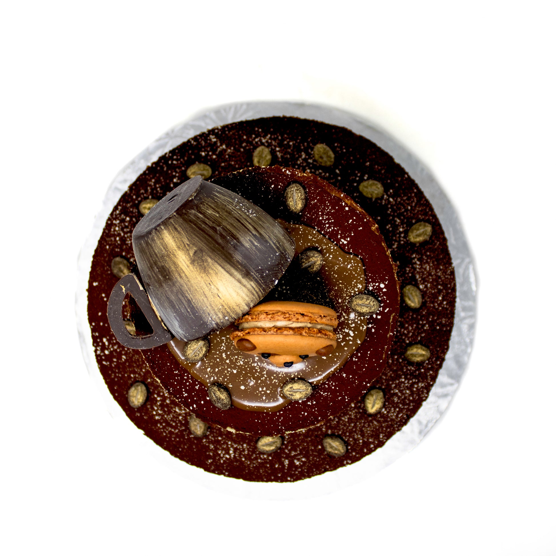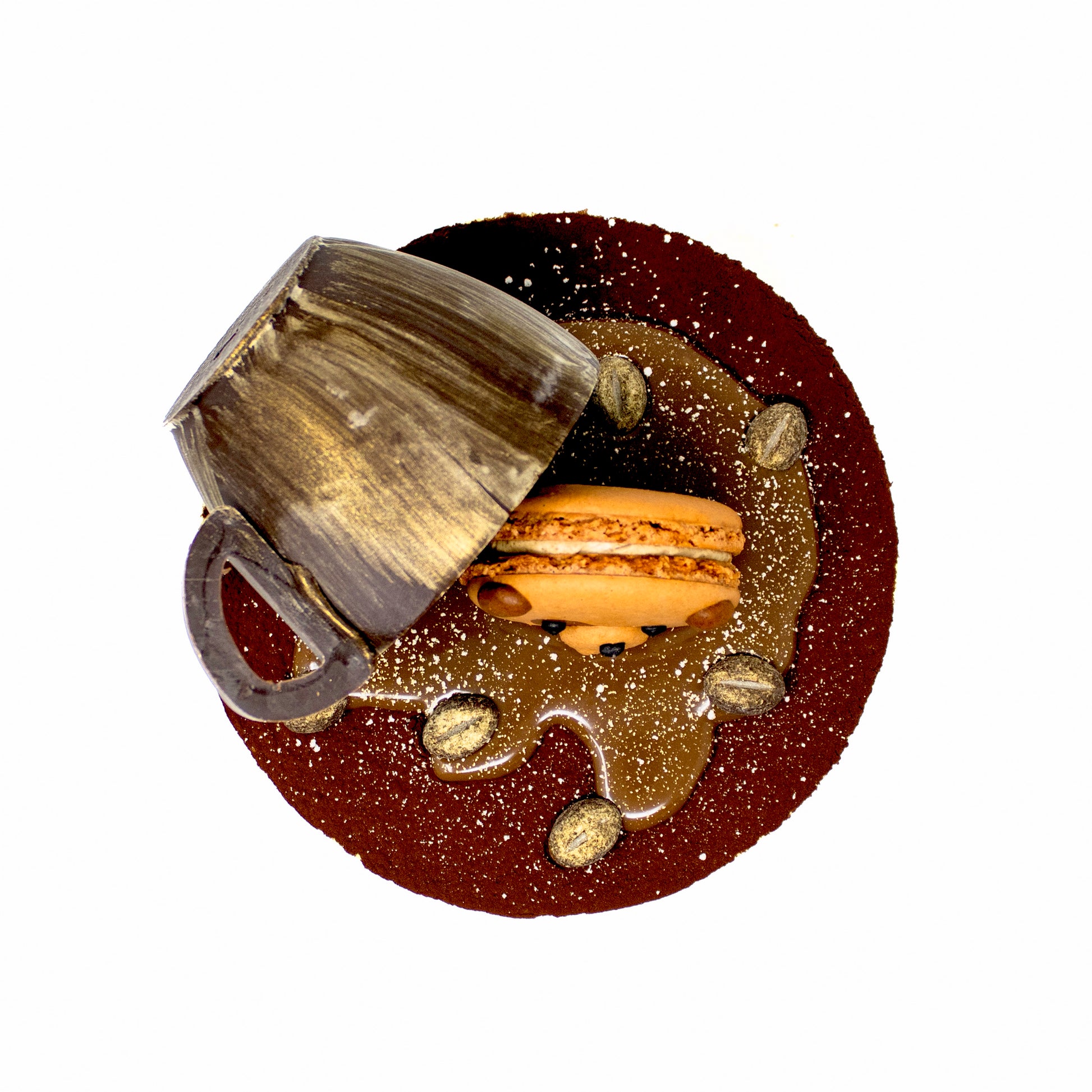 garnish/decorations: dark chocolate, cocoa powder, gold dust, coffee ganache, macarons (contain almond flour, alcohol, butter, cornstarch, cream, eggs, icing sugar, sugar, coffee extract, mascarpone, white chocolate, whip topping (contains soya)), chocolate coffee beans (sugar, cocoa mass, cocoa butter, coffee, emulsifier: lecithin, natural flavouring, glazing agent E904/E414, natural vanilla flavouring)