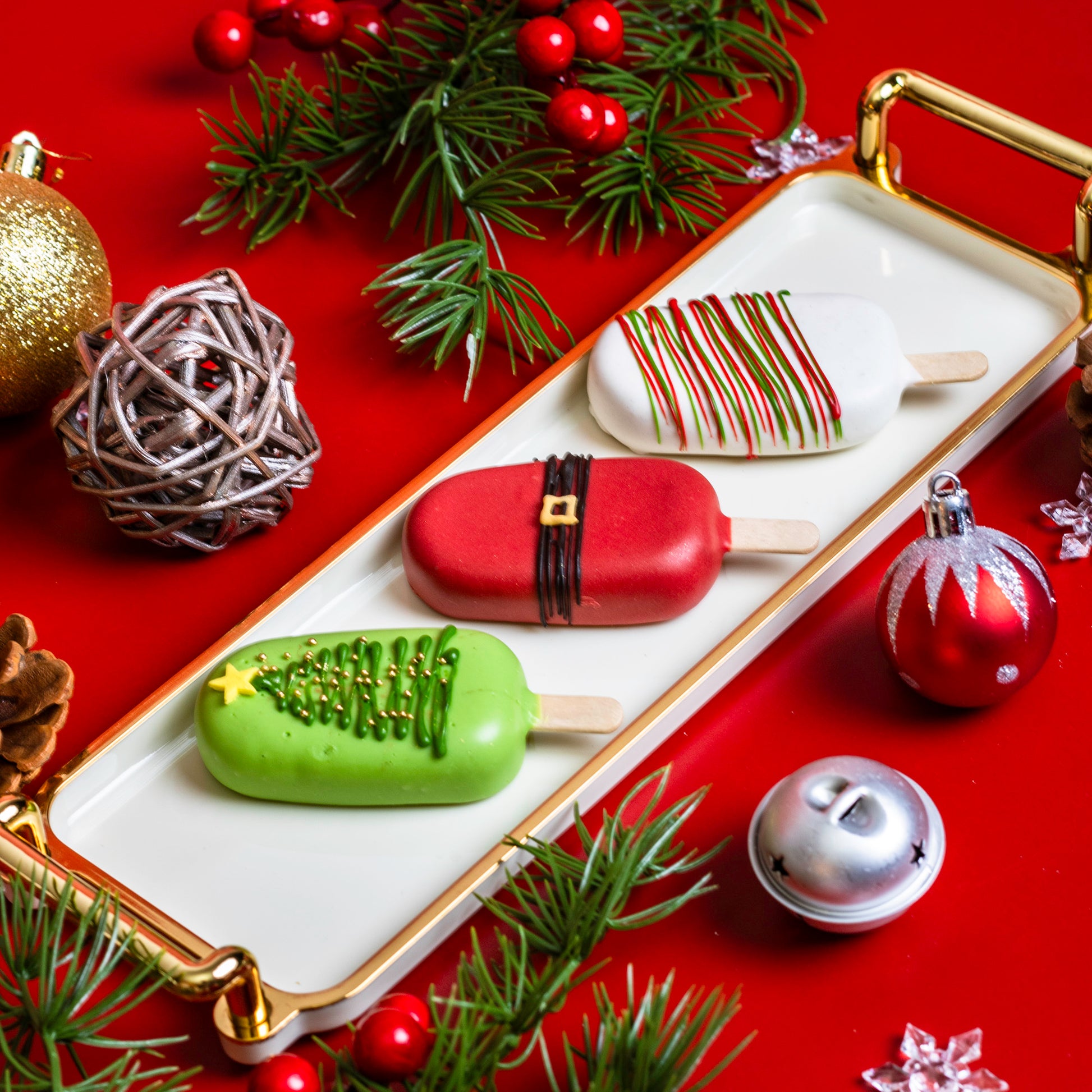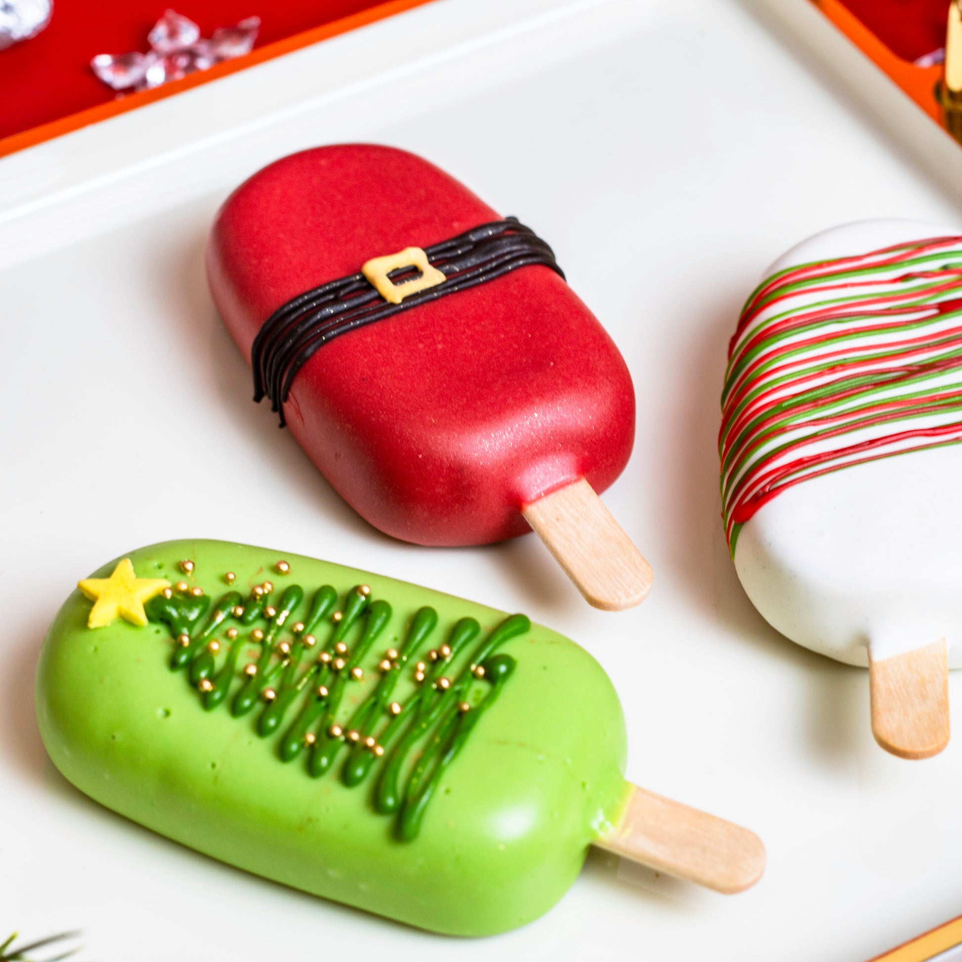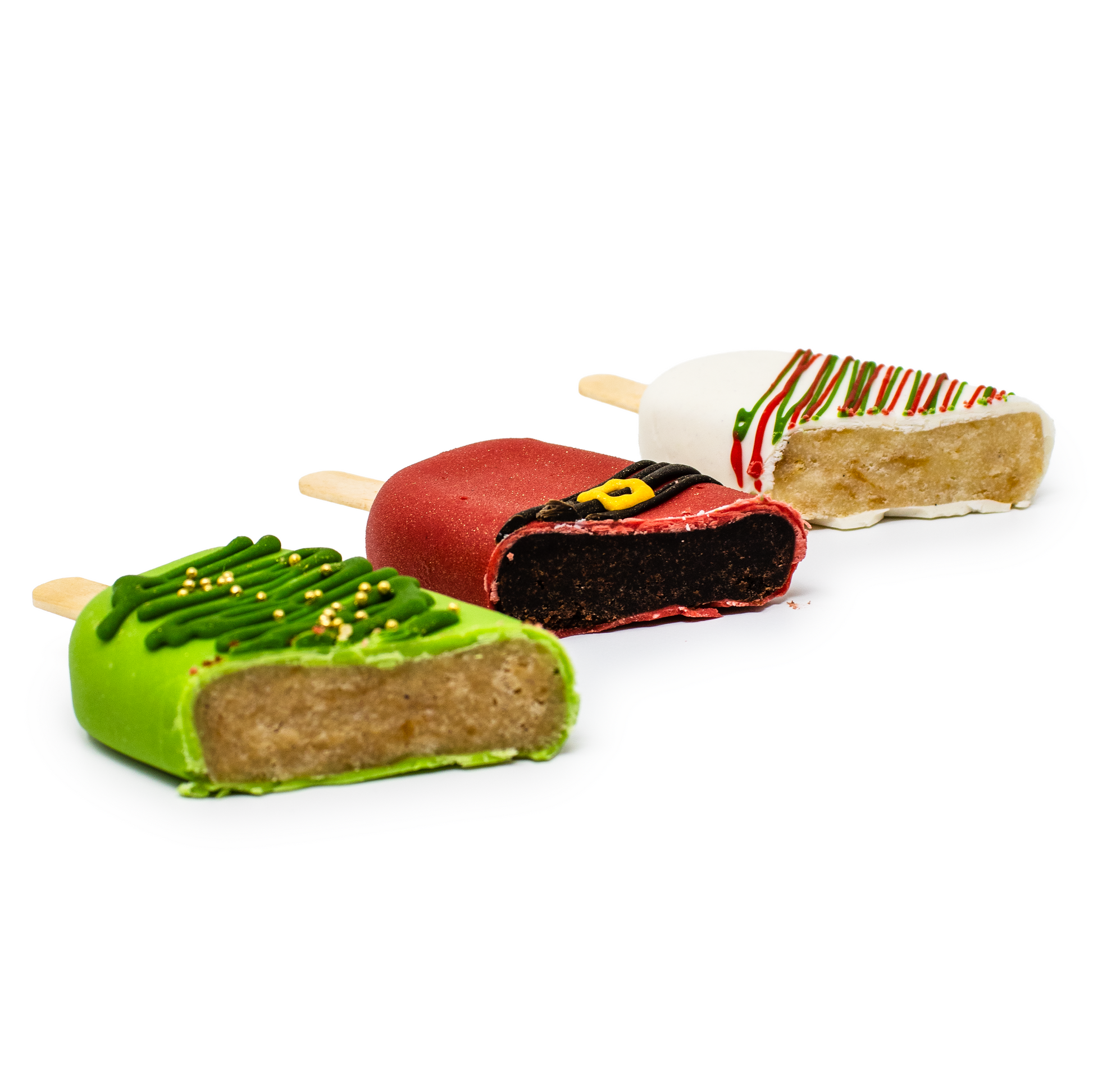 节日气氛满满,趣味十足,美味非凡!这些节日主题蛋糕棒造型可爱、颜值满分!无论是派对、圣诞袜小礼物,还是槲寄生下的甜蜜瞬间,都是完美之选! 成分: 红绿糖霜款:香草口味 圣诞树款:Biscoff 风味饼干口味 圣诞老人腰带款:巧克力树莓口味