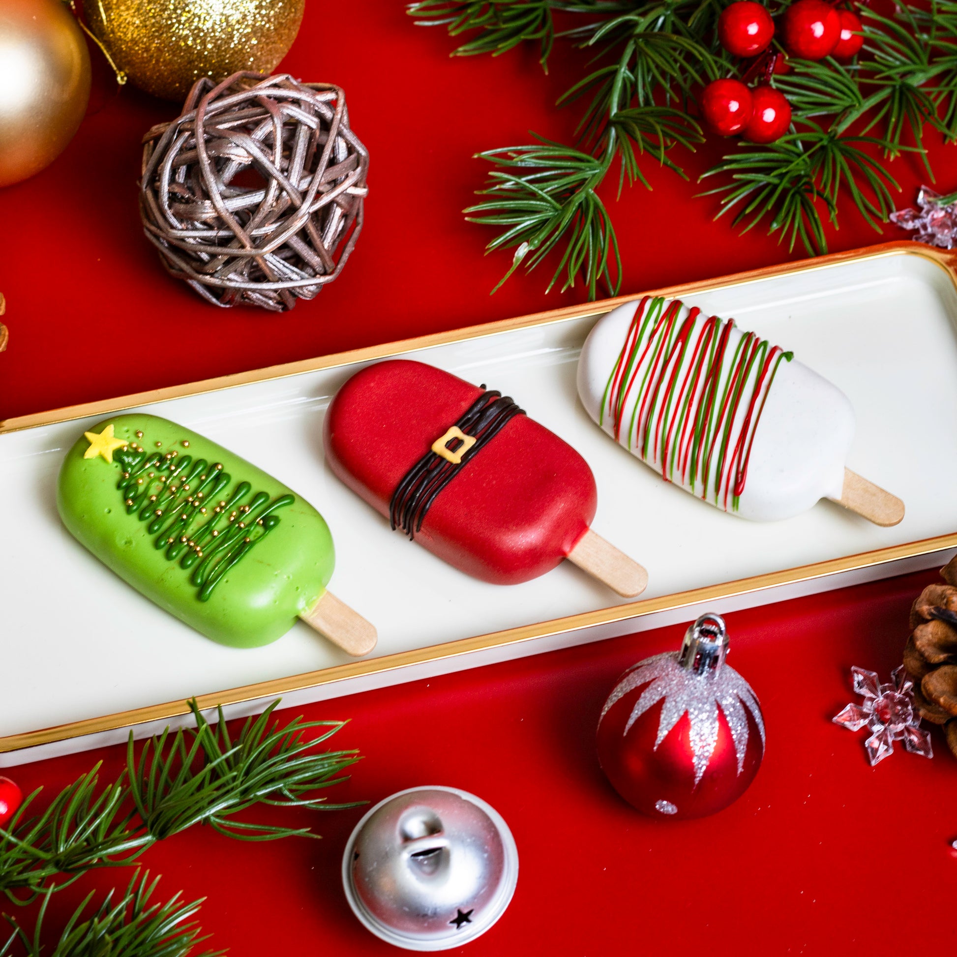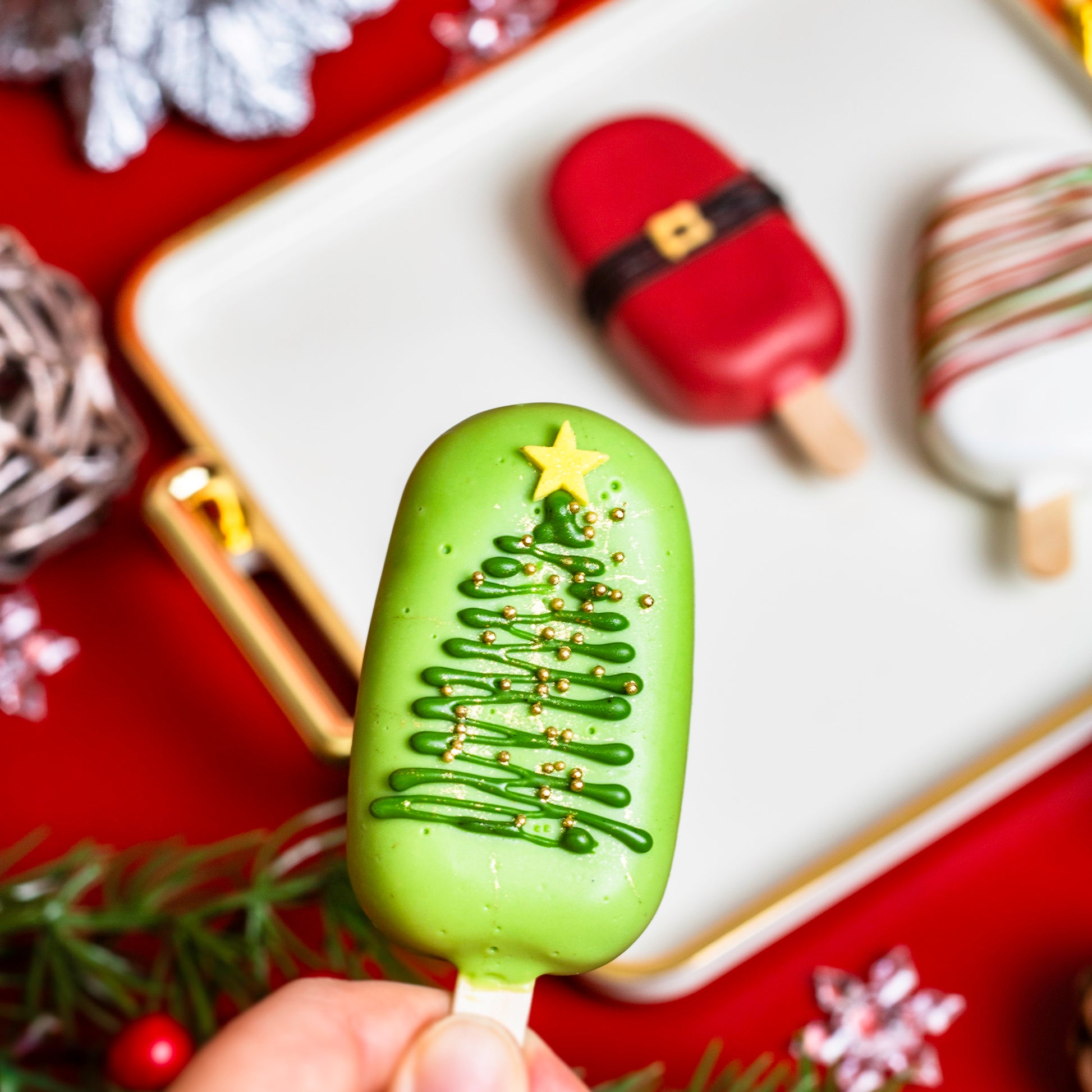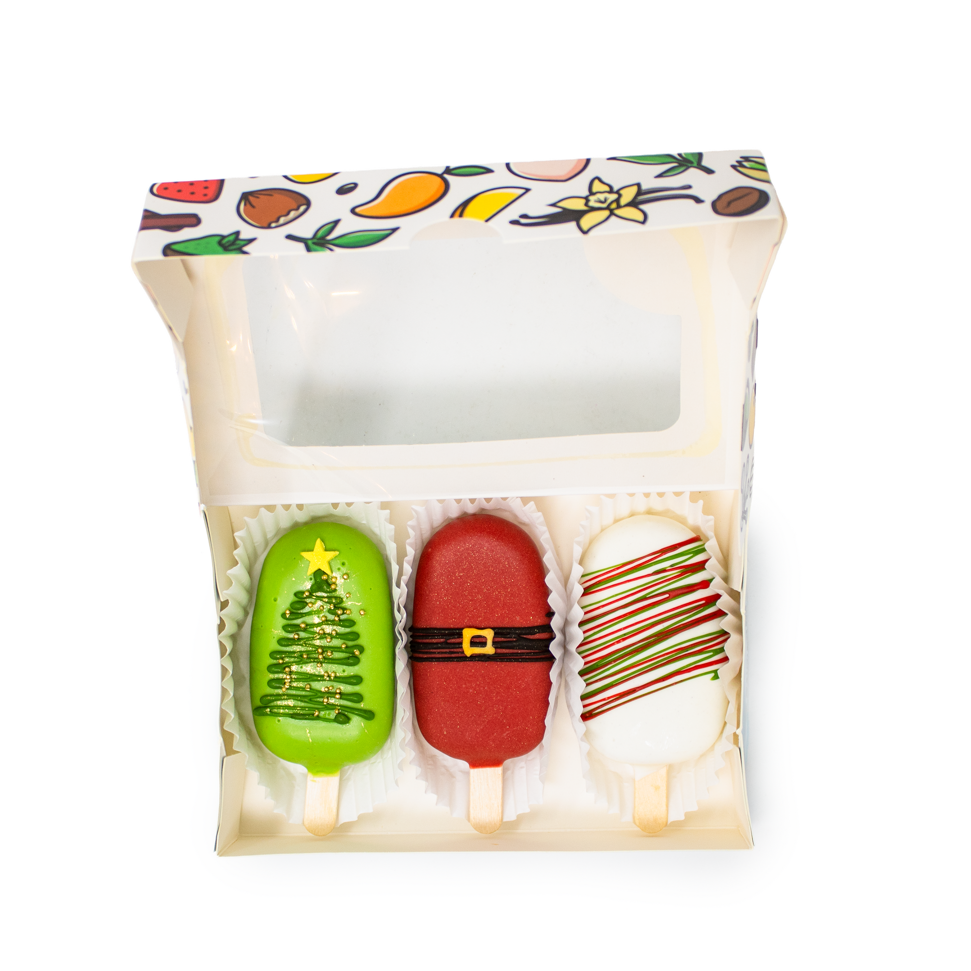节日气氛满满,趣味十足,美味非凡!这些节日主题蛋糕棒造型可爱、颜值满分!无论是派对、圣诞袜小礼物,还是槲寄生下的甜蜜瞬间,都是完美之选! 成分: 红绿糖霜款:香草口味 圣诞树款:Biscoff 风味饼干口味 圣诞老人腰带款:巧克力树莓口味
